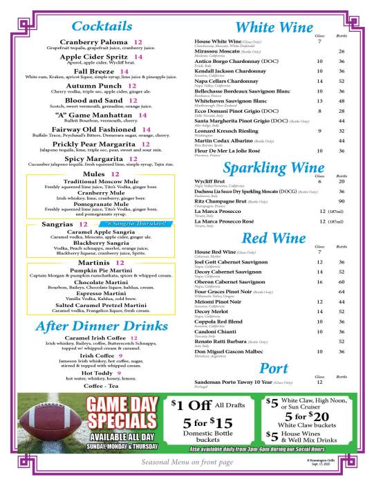 Kennsington Grille Menu