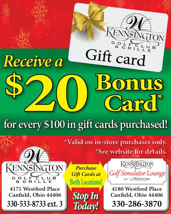 Holiday Bonus Cards! HURRY – Last day for $20 Bonus Cards is Wednesday, December 31st! Stop in… Pro Shop open daily 8:00am – 5:00pm! Valid on in-store gift card purchases only
